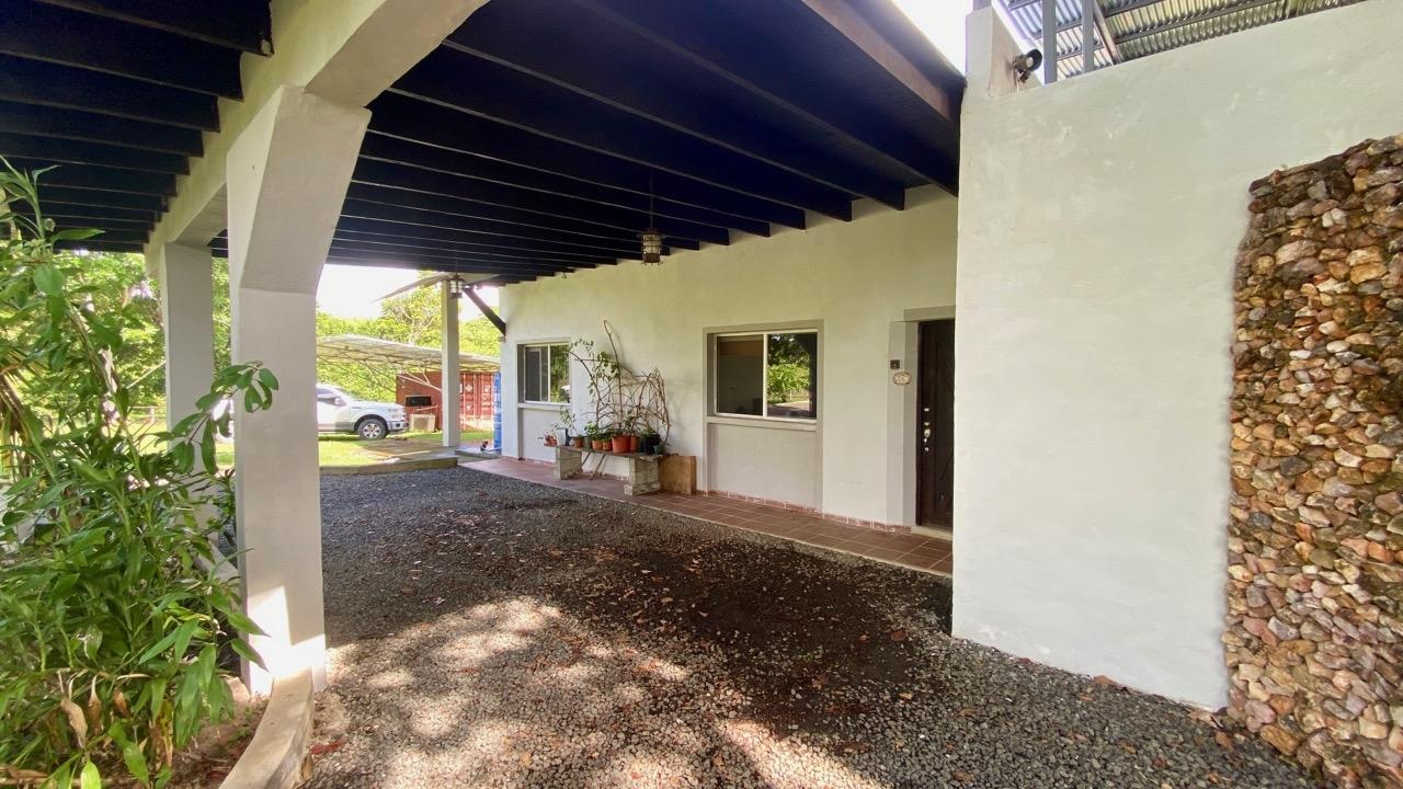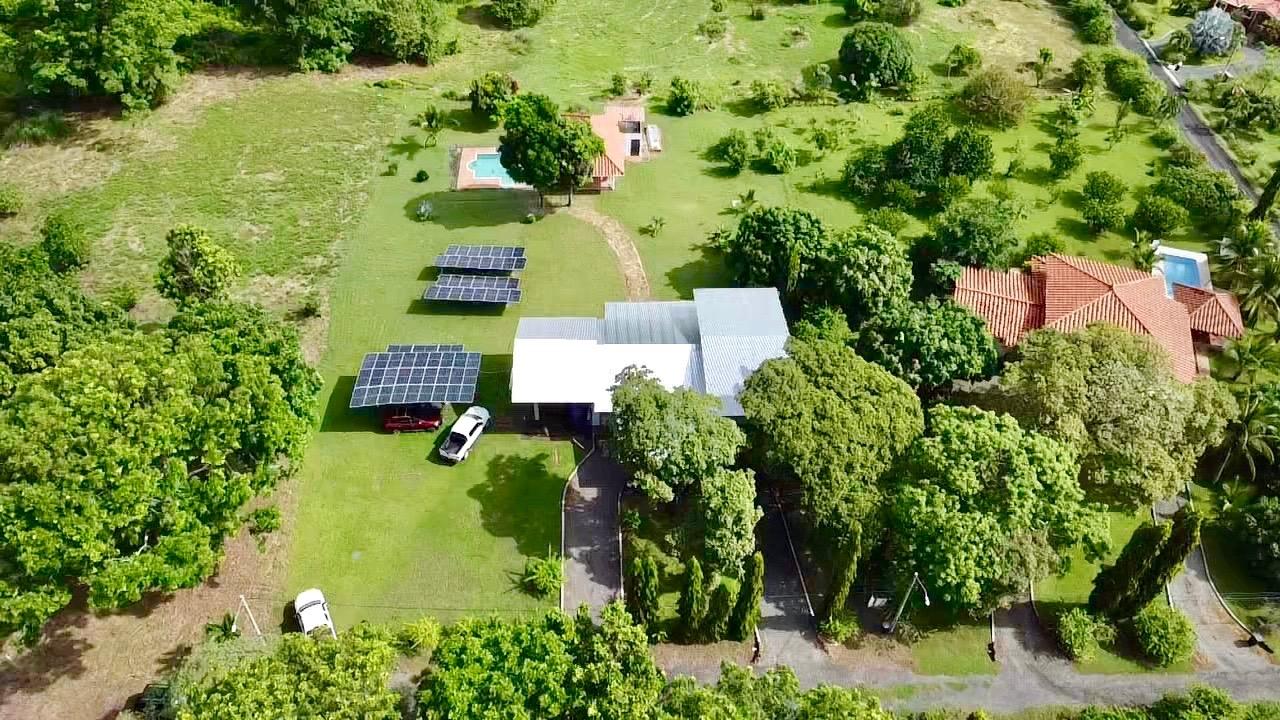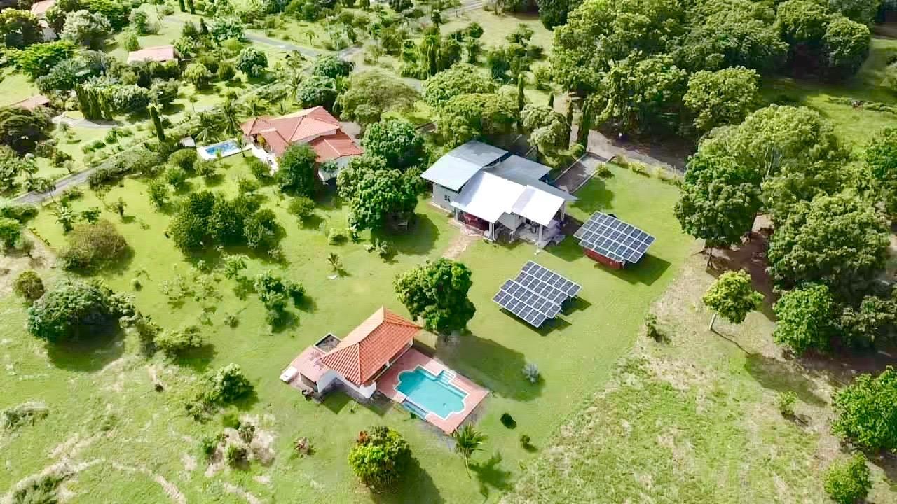 Full solar three bedrooms house, with a nice pool and a large landscaped land, about 10 minutes away from Coronado. It’s located in the complex Las Quintas de Cabuya, on the way to the village of Cabuya. It’s a very friendly complex with about 20 houses, surrounded by mountains. It’s offering some nice views and a sweet breeze all along the year. There is a small social area with a pool and gazebos. It has a colonial style. The ceilings are very high and made of solid dark wood. The construction is from 2014. With a surface area of approximately 200m2, and 3,400m2 of garden, with fruit trees, this property enjoys a privileged location, in a dead end street. It has the following features: •Large living room, terrace access, •Open kitchen, fitted and equipped, with dining area, •1st Bedroom, with private bathroom and a mezzanine, AC & ceiling fan, •2nd Bedroom, also with private bathroom, AC & ceiling fan, •3rd Bedroom, AC & ceiling fan, •Separate full bathroom, •Covered terrace, •Outside restroom, •Pool and large gazebo with outside kitchen, brick oven, full bathroom and large storage, •Laundry room, •Garden shed, •60m2 lookout platform with water & electricity, •Many parking spaces. •20 feet refrigerated and insulated container with solar system, batteries and controls. The 3,400m2 garden is fully landscaped, with many fruits trees as papaya, piña, mango, banana, coconut, soursop, lemon, orange & mandarin. This full solar three bedrooms house, colonial style, is a very good option for those who are looking for a self sufficient home, large enough for the whole family, in a quiet and safe neighborhood.