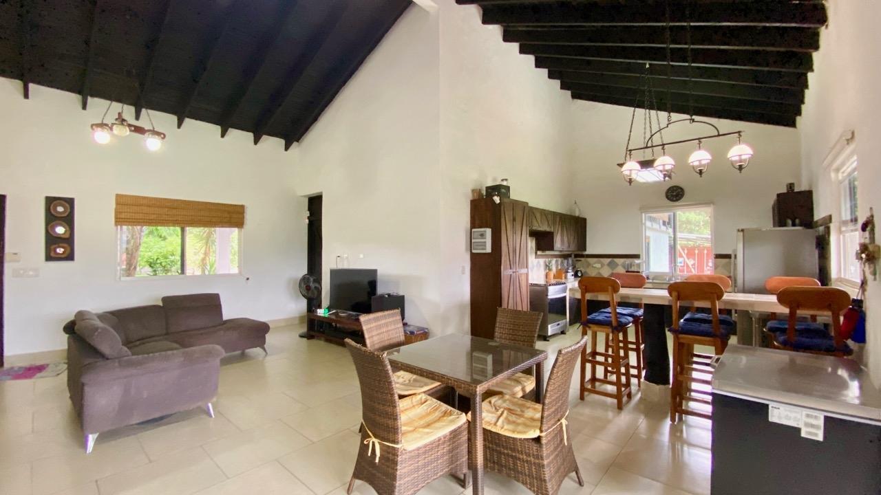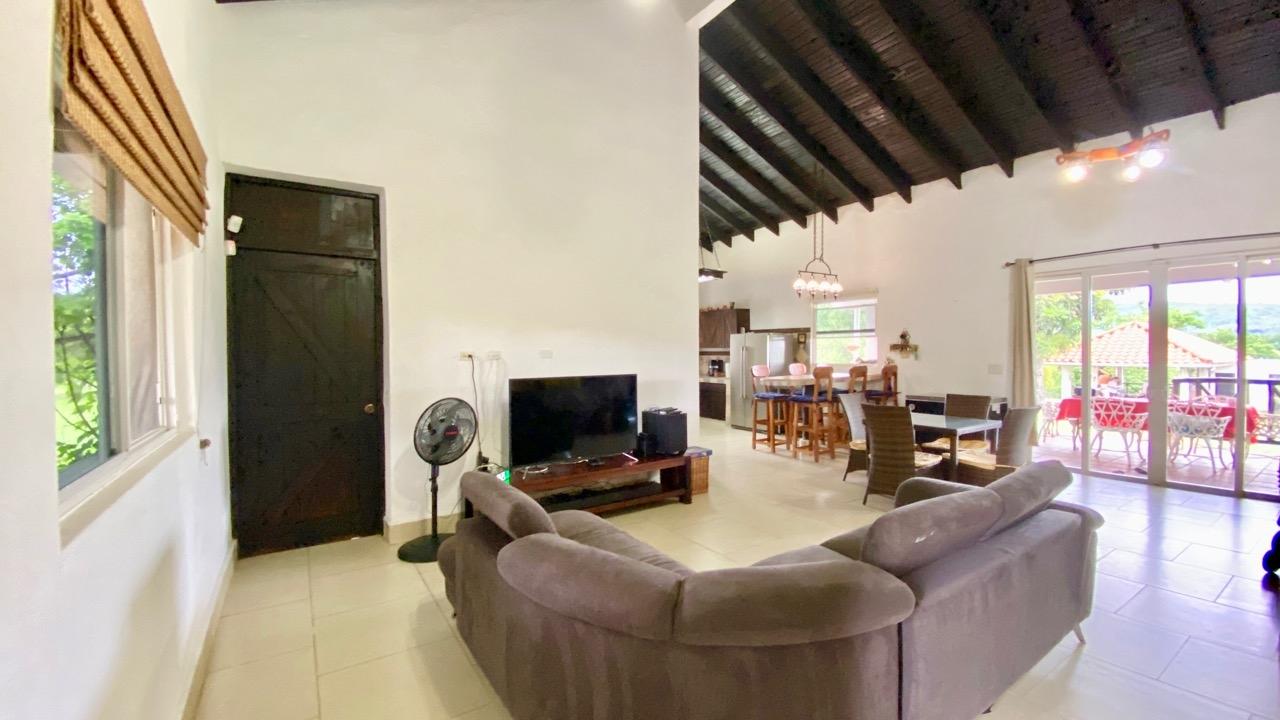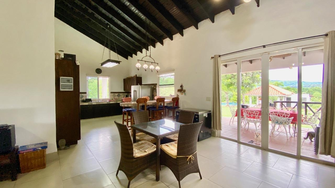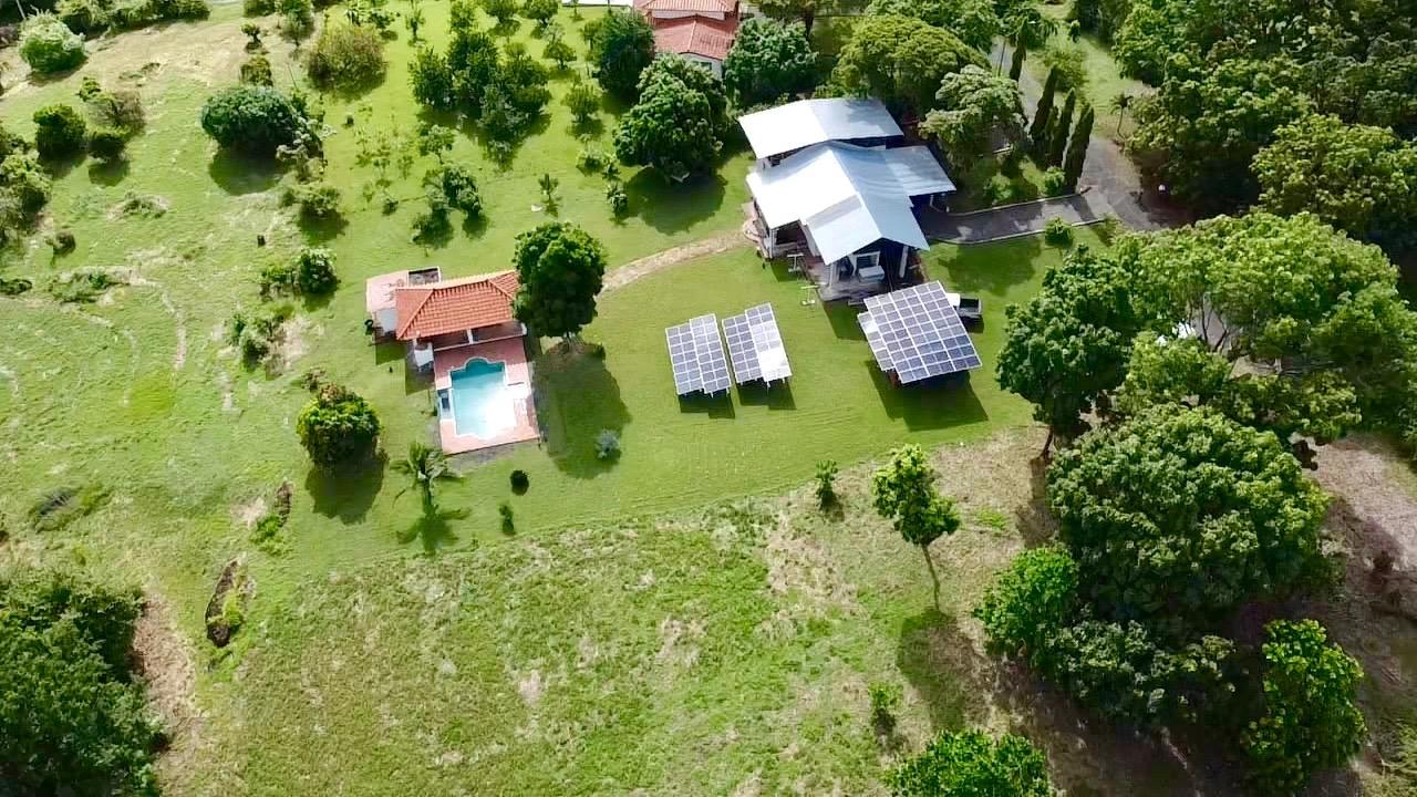 Full solar three bedrooms house, with a nice pool and a large landscaped land, about 10 minutes away from Coronado. It’s located in the complex Las Quintas de Cabuya, on the way to the village of Cabuya. It’s a very friendly complex with about 20 houses, surrounded by mountains. It’s offering some nice views and a sweet breeze all along the year. There is a small social area with a pool and gazebos. It has a colonial style. The ceilings are very high and made of solid dark wood. The construction is from 2014. With a surface area of approximately 200m2, and 3,400m2 of garden, with fruit trees, this property enjoys a privileged location, in a dead end street. It has the following features: •Large living room, terrace access, •Open kitchen, fitted and equipped, with dining area, •1st Bedroom, with private bathroom and a mezzanine, AC & ceiling fan, •2nd Bedroom, also with private bathroom, AC & ceiling fan, •3rd Bedroom, AC & ceiling fan, •Separate full bathroom, •Covered terrace, •Outside restroom, •Pool and large gazebo with outside kitchen, brick oven, full bathroom and large storage, •Laundry room, •Garden shed, •60m2 lookout platform with water & electricity, •Many parking spaces. •20 feet refrigerated and insulated container with solar system, batteries and controls. The 3,400m2 garden is fully landscaped, with many fruits trees as papaya, piña, mango, banana, coconut, soursop, lemon, orange & mandarin. This full solar three bedrooms house, colonial style, is a very good option for those who are looking for a self sufficient home, large enough for the whole family, in a quiet and safe neighborhood.