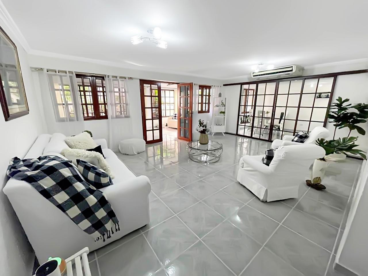 Beautiful and impeccable corner house with parking, portal, terrace, laundry room, storage room and rear patio: -The parking lot has capacity for three (3) cars and maintains, like the portal, a cobblestone floor next to a concrete slab roof with smooth plaster, it has two electric gates made of rolling metal sheets. -The terrace has a tile floor, next to a tongue and groove wood ceiling and a tile roof on a metal structure. -The laundry room has a cobblestone floor next to a concrete slab ceiling with smooth plaster. -The storage room has a rubber-covered concrete floor, next to a concrete slab roof with smooth plaster. -The rear patio and the laundry room have cobblestones, a portion of clay and synthetic grass in the front patio. It also has a block wall around its perimeter. Four bedrooms Three bathrooms Service room and bathroom.