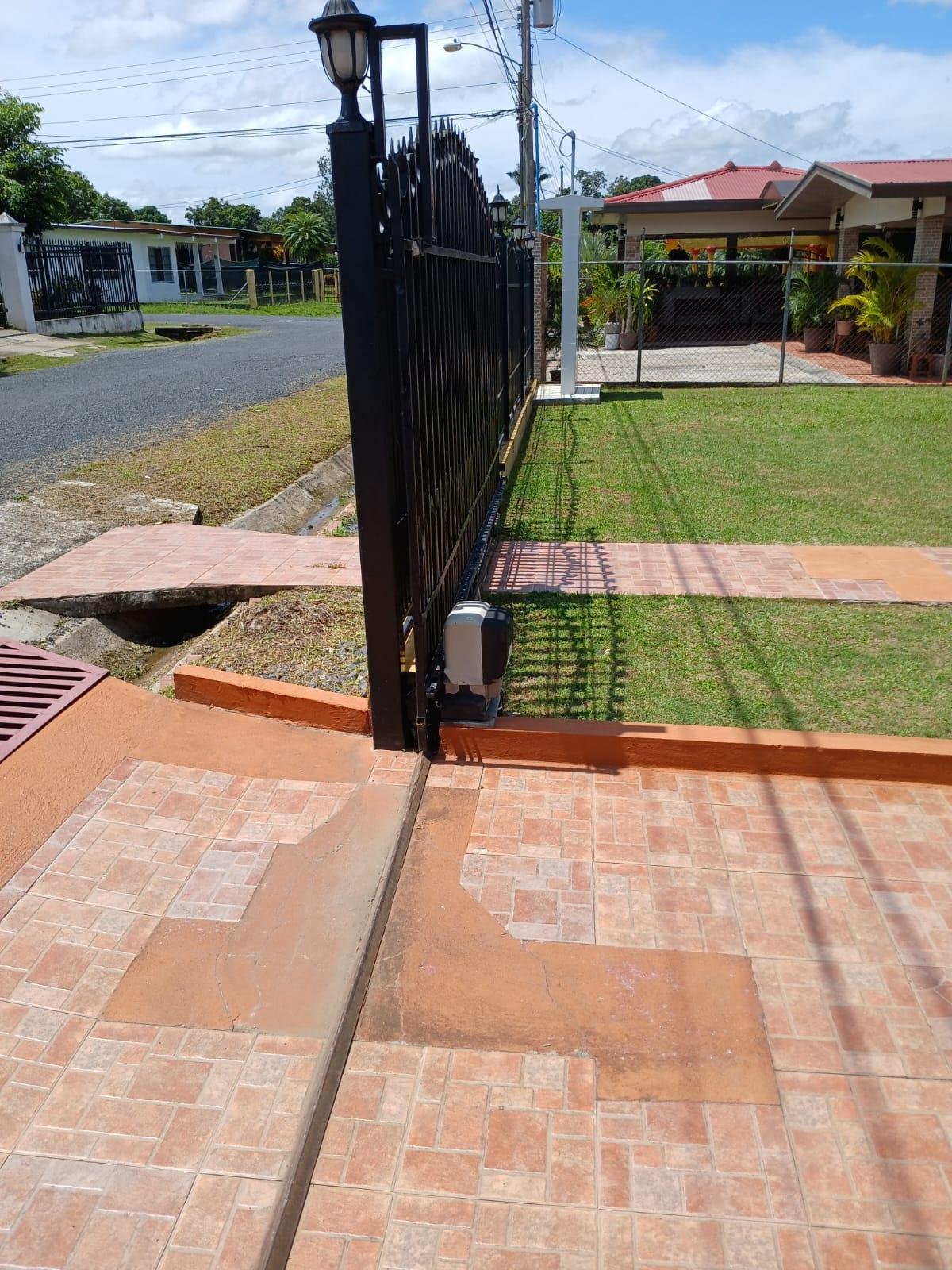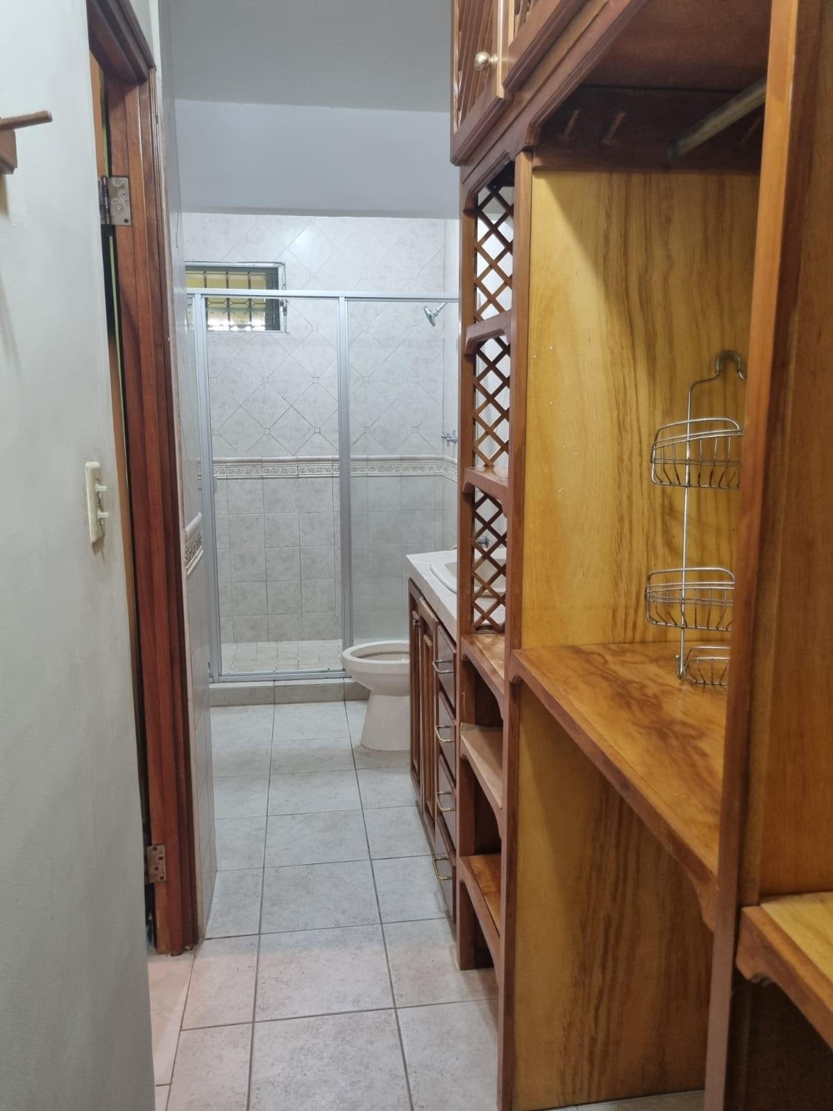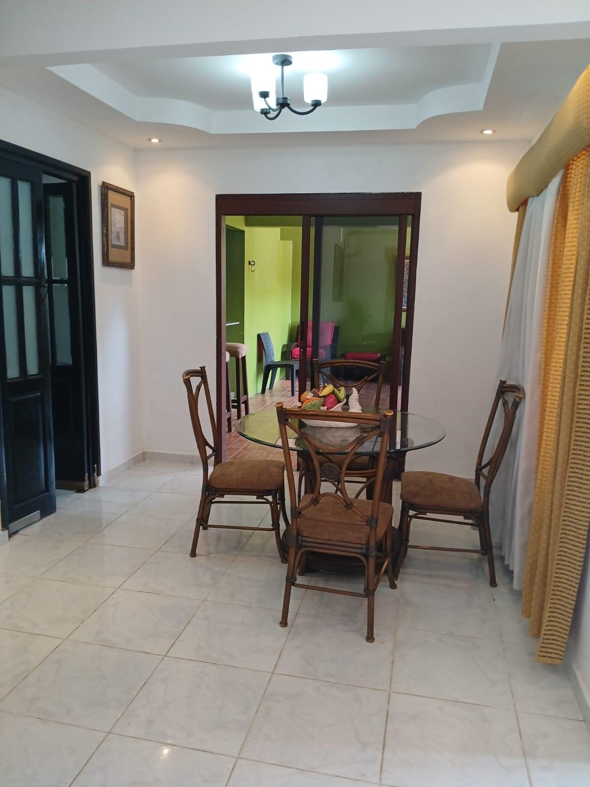 A house with 3 bedrooms, 2 bathrooms, a living-dining room, an open kitchen, a covered laundry room, a maid’s quarters, and a storage room. This house has air conditioning in all bedrooms and the living-dining room, and is fully furnished and stocked with appliances. It features a good layout, a hut, and a lovely garden. It also has an electric gate and is fully fenced.