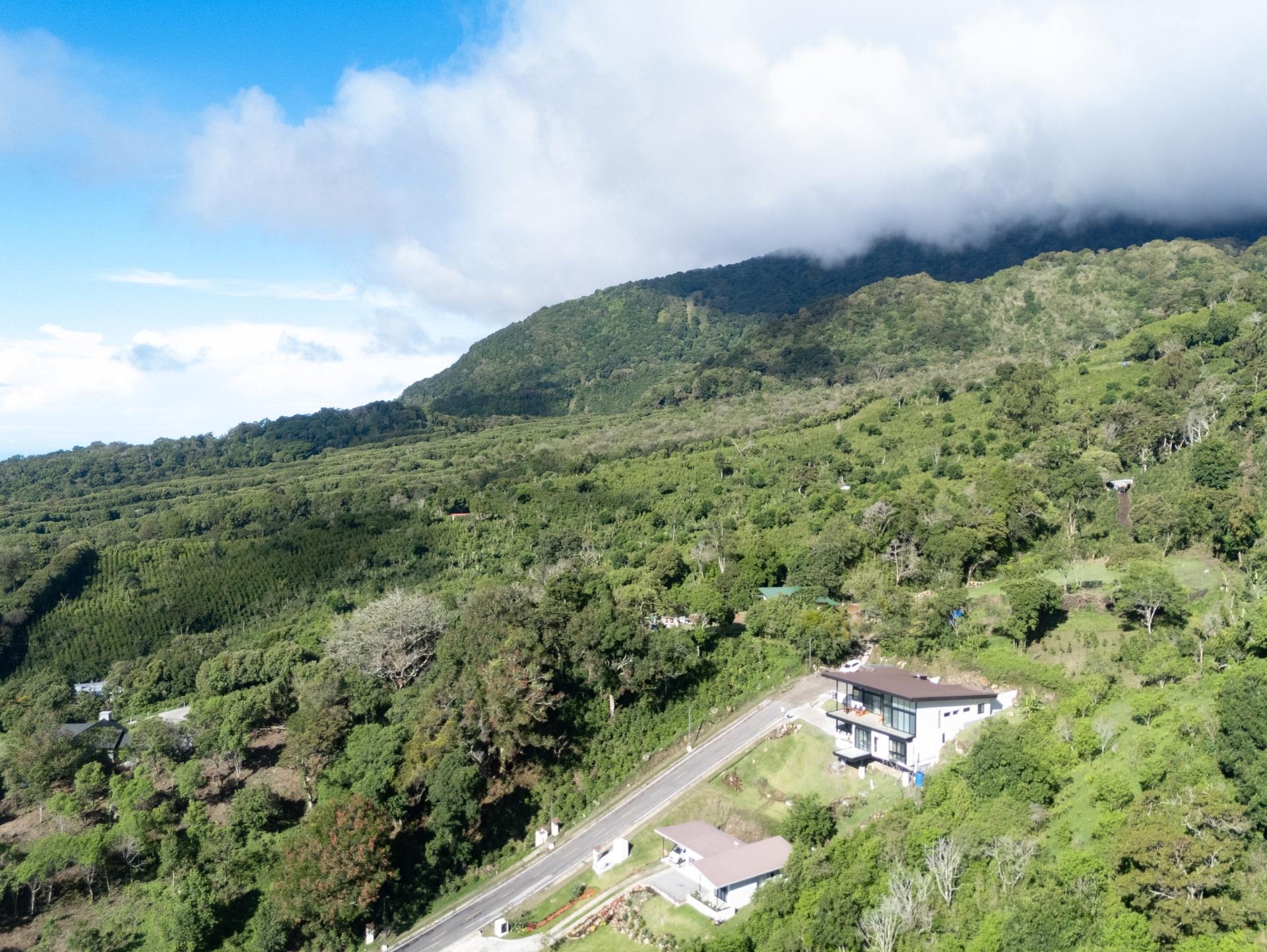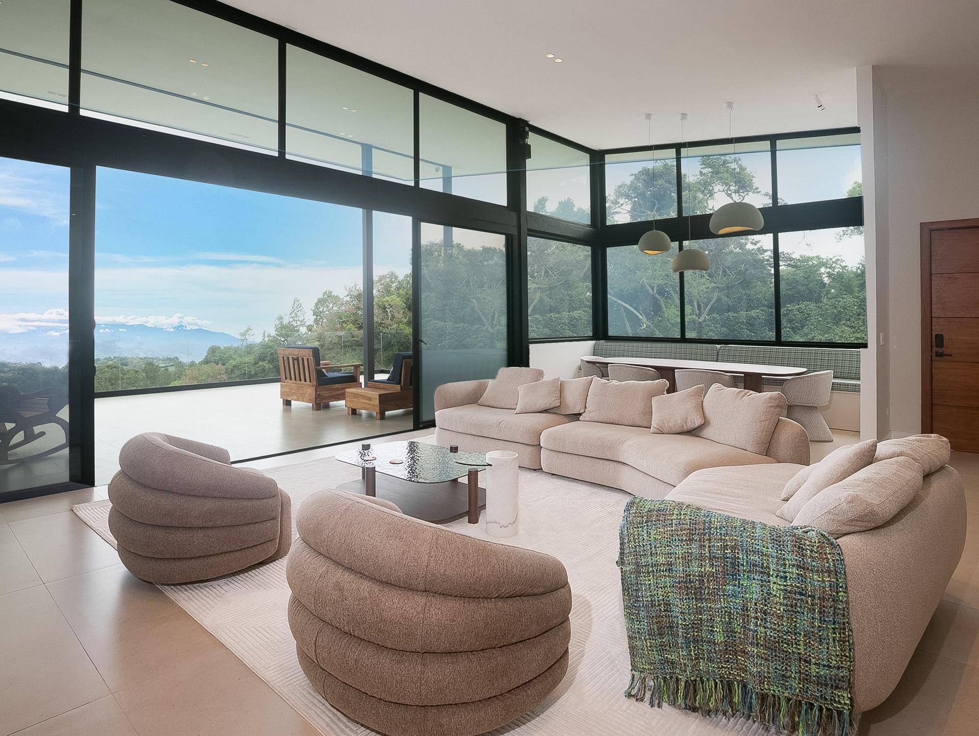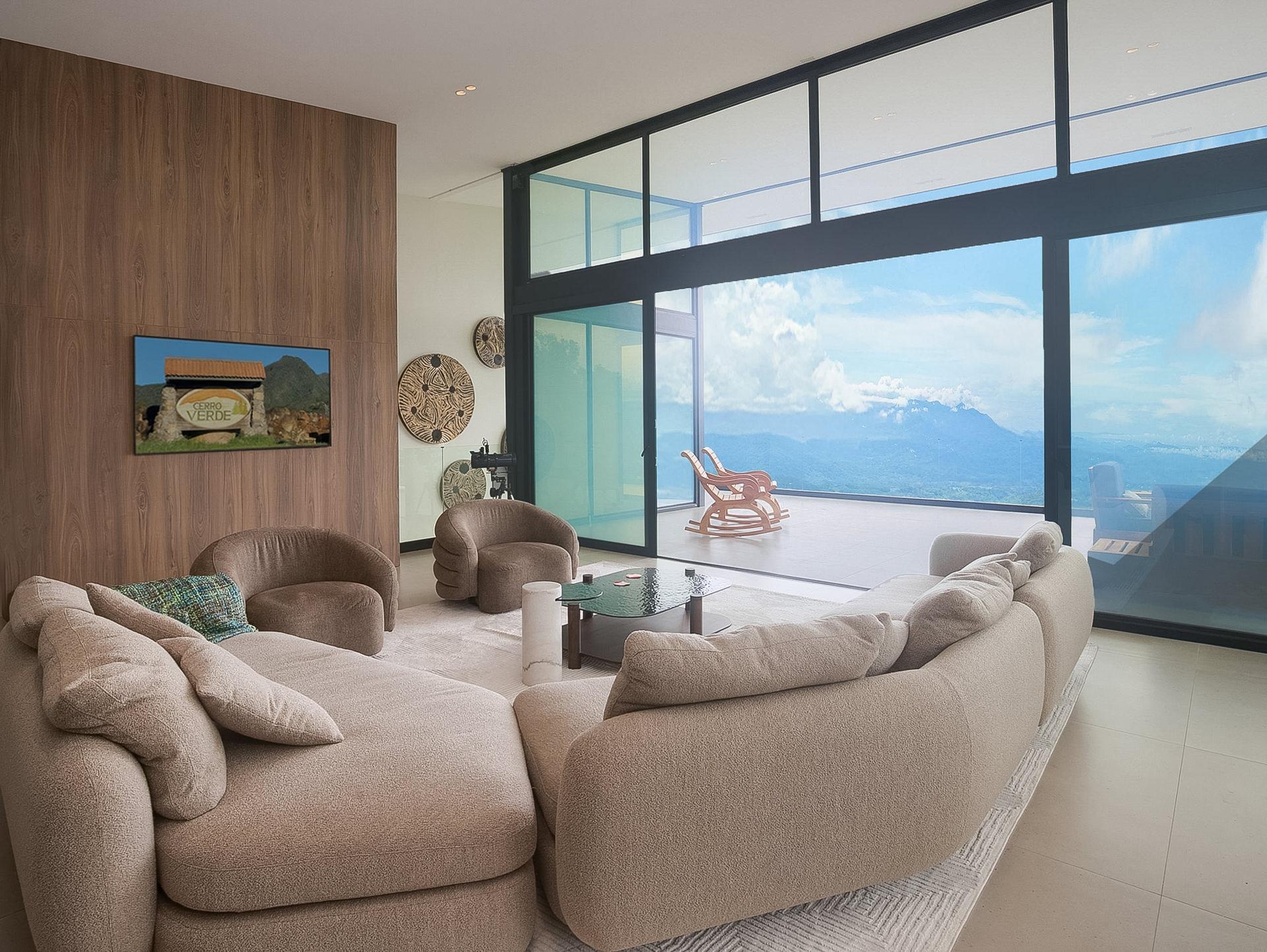 Stunning new 2025 custom-built home in Cerro Verde, Volcancito Arriba, offering jaw-dropping mountain views and a sleek modern design. With 3,493 sq ft of interior space plus 346 sq ft of tiled decks, this 2-bed, 2-bath main home includes a separate 1-bed, 1-bath lock-off apartment—perfect for guests or rental income. Designed to maximize the view, floor-to-ceiling glass walls feature remote-controlled SmartFilm™ for instant privacy. The graphite-gray kitchen showcases Samsung Bespoke appliances, Blanco granite sink, touch faucet, custom cabinetry, LED lighting, and a built-in dog feeding station. Primary suite features vaulted ceilings, a view terrace, custom lighting, and a spa-style bath with zero-entry rain shower. Lower-level apartment has a private entrance, deck, full kitchen, and living area with panoramic views. Extras include Starlink internet, smart home system, HD security, backup generator, rain catchment, dual dehumidifiers, tankless water heater, and under-house storage. Landscaped lot with fruit trees, custom teak furniture, and glass railings. Located in a quiet, established community just 10 minutes to downtown Boquete with paved roads, sidewalks, and underground utilities. A rare blend of luxury, privacy, and innovation.