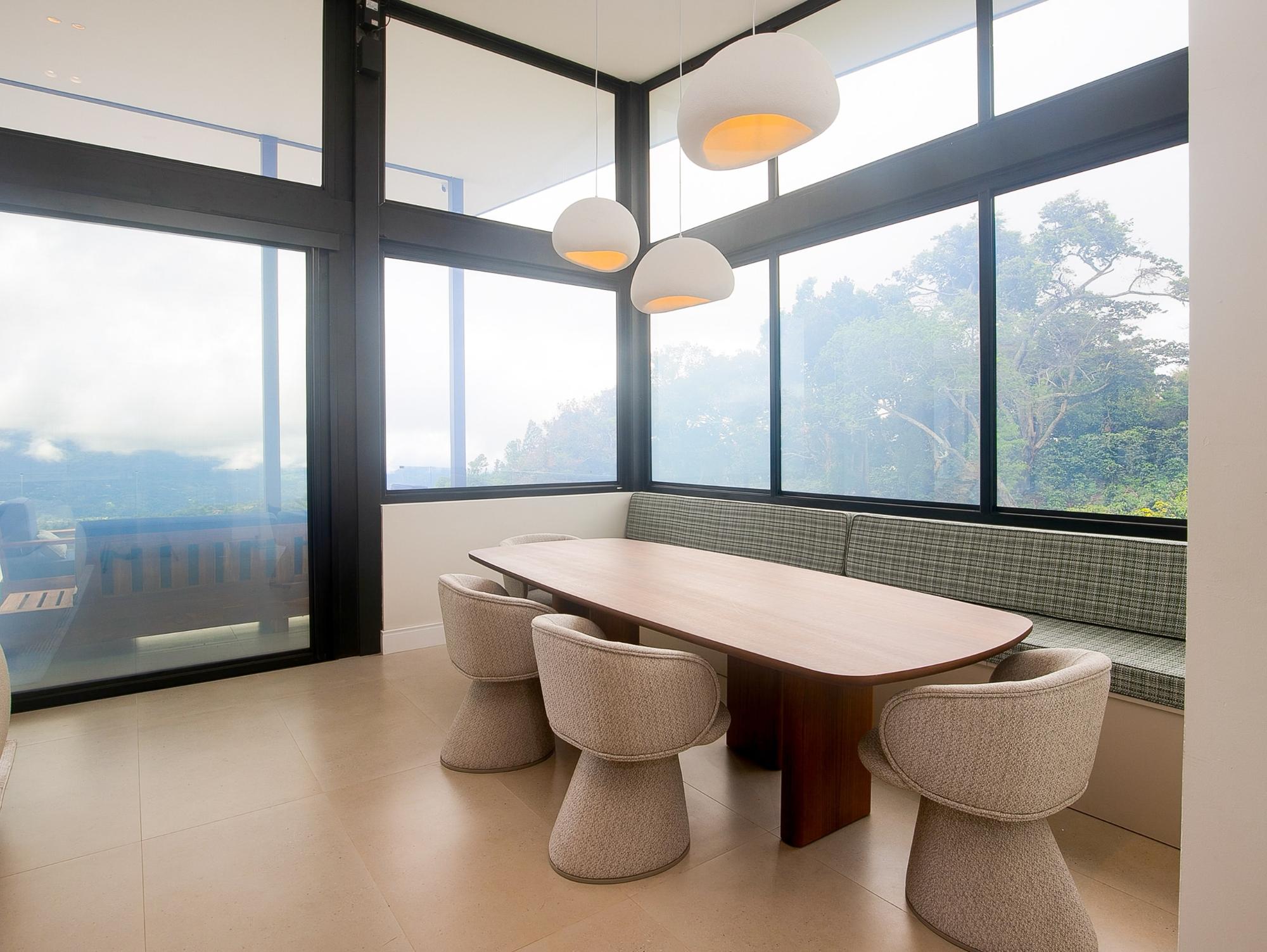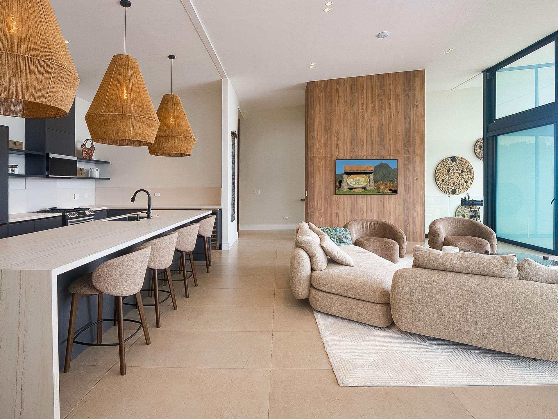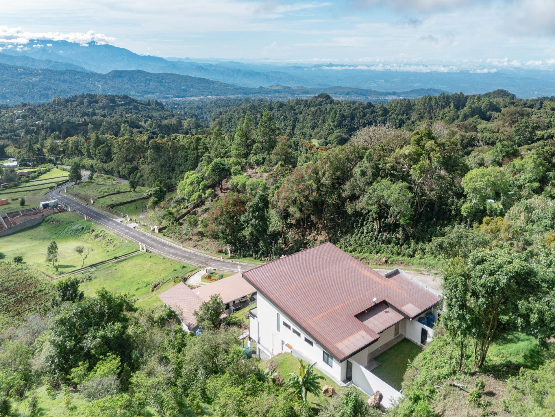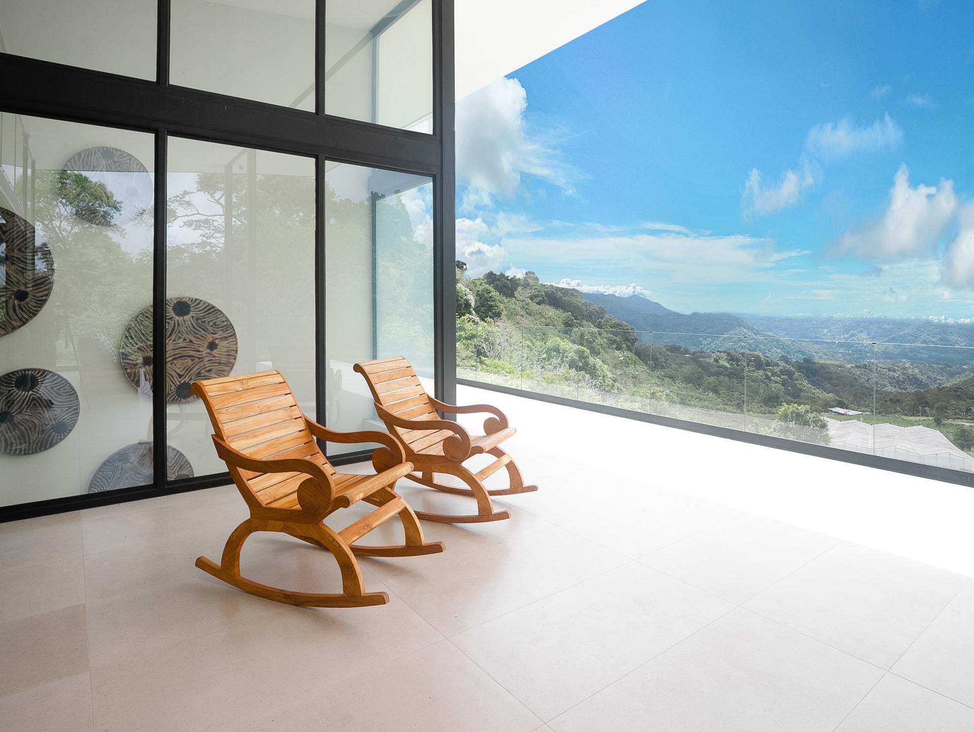 Stunning new 2025 custom-built home in Cerro Verde, Volcancito Arriba, offering jaw-dropping mountain views and a sleek modern design. With 3,493 sq ft of interior space plus 346 sq ft of tiled decks, this 2-bed, 2-bath main home includes a separate 1-bed, 1-bath lock-off apartment—perfect for guests or rental income. Designed to maximize the view, floor-to-ceiling glass walls feature remote-controlled SmartFilm™ for instant privacy. The graphite-gray kitchen showcases Samsung Bespoke appliances, Blanco granite sink, touch faucet, custom cabinetry, LED lighting, and a built-in dog feeding station. Primary suite features vaulted ceilings, a view terrace, custom lighting, and a spa-style bath with zero-entry rain shower. Lower-level apartment has a private entrance, deck, full kitchen, and living area with panoramic views. Extras include Starlink internet, smart home system, HD security, backup generator, rain catchment, dual dehumidifiers, tankless water heater, and under-house storage. Landscaped lot with fruit trees, custom teak furniture, and glass railings. Located in a quiet, established community just 10 minutes to downtown Boquete with paved roads, sidewalks, and underground utilities. A rare blend of luxury, privacy, and innovation.
