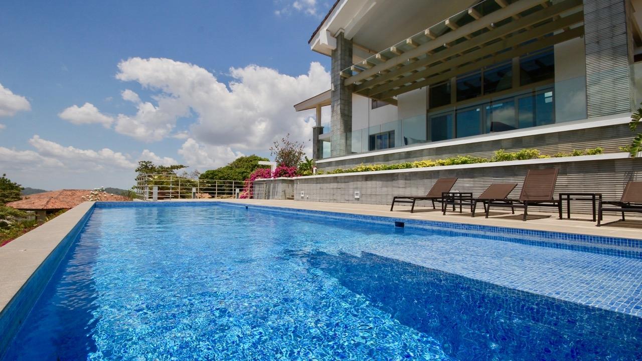 Luxurious 6-bedroom villa with pool located in Los Pozos, just 10 minutes from Coronado. Built on a hillside, in the heart of a vast 180-acre eco-environmental-type residential project, with security 24/7, this 2-storey villa offers spectacular views of the Pacific and mountains. THE VILLA : Built in 2012 by an architect, this luxurious villa is composed as follows: 1 – On Ground Floor • Entrance, • Cathedral room with high ceilings, • Dining room, • Fitted and equipped kitchen, • Dining room, • Office (or bedroom), • Painting workshop (or room), • Small terrace, • Guest WC, • Laundry room • Caretaker room • Double covered parking access, • Large terrace overlooking the pool with outdoor lounge, • Numerous and spacious storage spaces 2 – First floor • Master suite with walkin closet, private bathroom, and two terraces with views, one on the ocean and one on the mountains. • Large room with balcony sea view, dressing room and private bathroom, • Two further bedrooms, with dressing room and private bathroom • play area overlooking the cathedral stay, • Ample storage. THE POOL : • Large rectangular pool of 125 sqm • Comfortable pool lodge with dining area, barbecue and full bath LAND : • 6,070 sqm • 300 meters elevation, the land is fully landscaped. • Personal well, 230 feet perforation. This luxurious villa, in perfect condition and fully equipped with Italian furniture, will seduce you with its architecture, its volumes, its brightness, its distribution and the quality of its finishes. Here, you live in harmony with nature. And you’re very close to Coronado and all amenities.