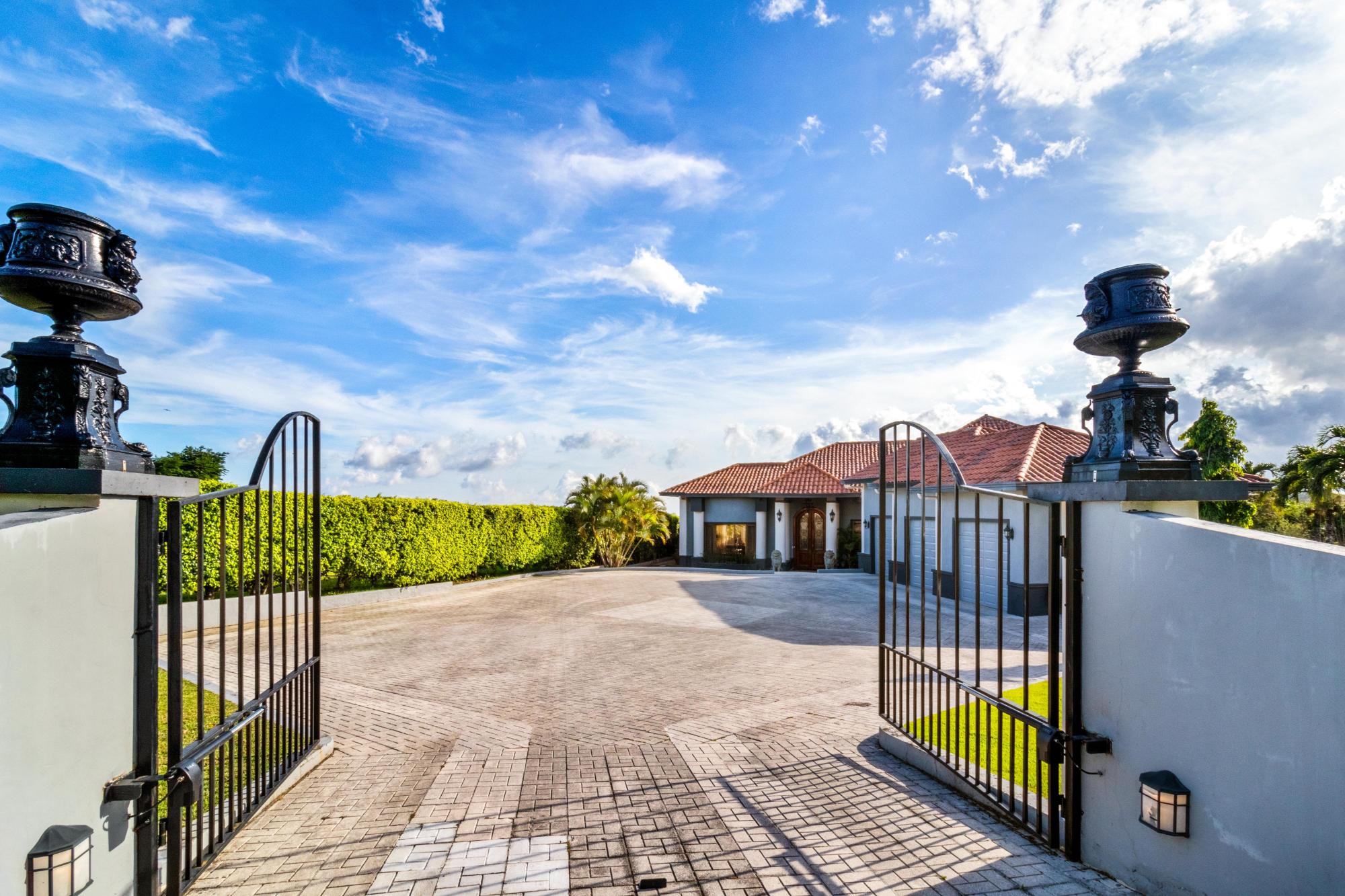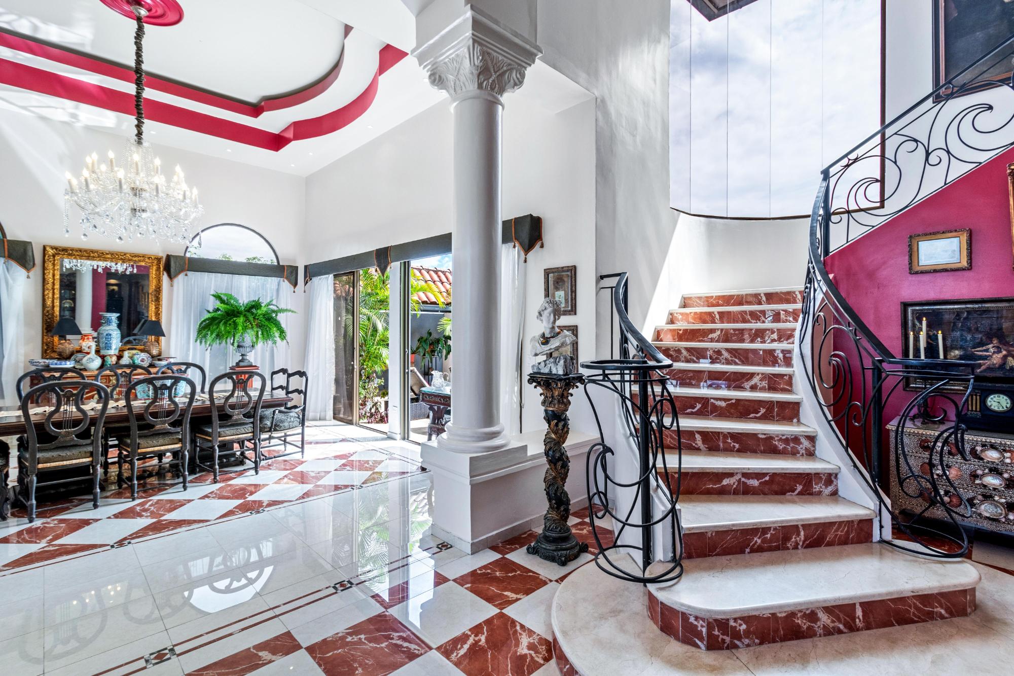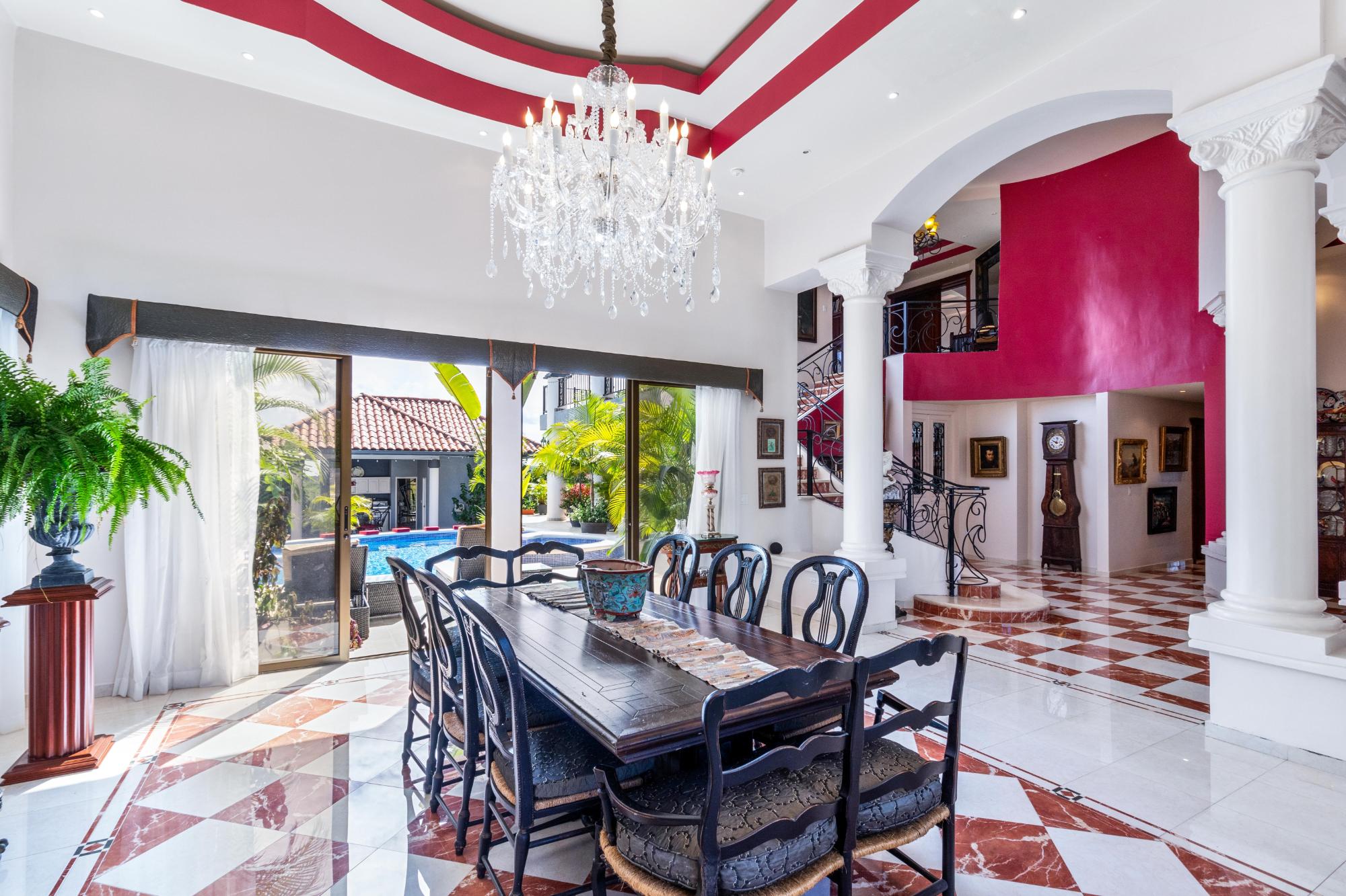 This magnificent mansion in Los Molinos is up for sale. It’s perched on the Canyon offering breathtaking views of the Pacific ocean, Volcan Baru and everything between. This home is true luxury and sophistication with 5 bedrooms, 5.5 bathrooms, 2 pools and a jacuzzi. As you step through the grand foyer, you are greeted with a sense of elegance and sophistication. This masterpiece has marble floors, stunning stain glass windows, and a grand curved staircase that exudes opulence. The formal dining room, perfect for hosting dinner parties or gatherings with family and friends, This stunning house boasts a large kitchen that seamlessly flows into the spacious living room, offering breathtaking views of the sparkling pools. The chef’s kitchen features top-of-the-line Viking appliances and a large walk-through pantry, perfect for all your culinary needs. With impeccable attention to detail and high-end finishes throughout This home has two large guest bedrooms, each boasting their own ensuite bathrooms and a walk-in closet. Joined by a small closed in terrace with views of the garden. Perfect for hosting family and friends to create their own peaceful retreats, they will never want to leave. Head up the grand curved staircase to the amazing master bedroom. This retreat boasts its own terrace, perfect for enjoying your morning coffee or watching the sunset. The spacious bedroom is complemented by a cozy sitting area, ideal for unwinding after a long day. The en-suite bathroom is an oasis in itself, But the real showstopper is the raised solid copper bathtub with breathtaking views of Volcan Baru that will make every bath feel like a spa day.