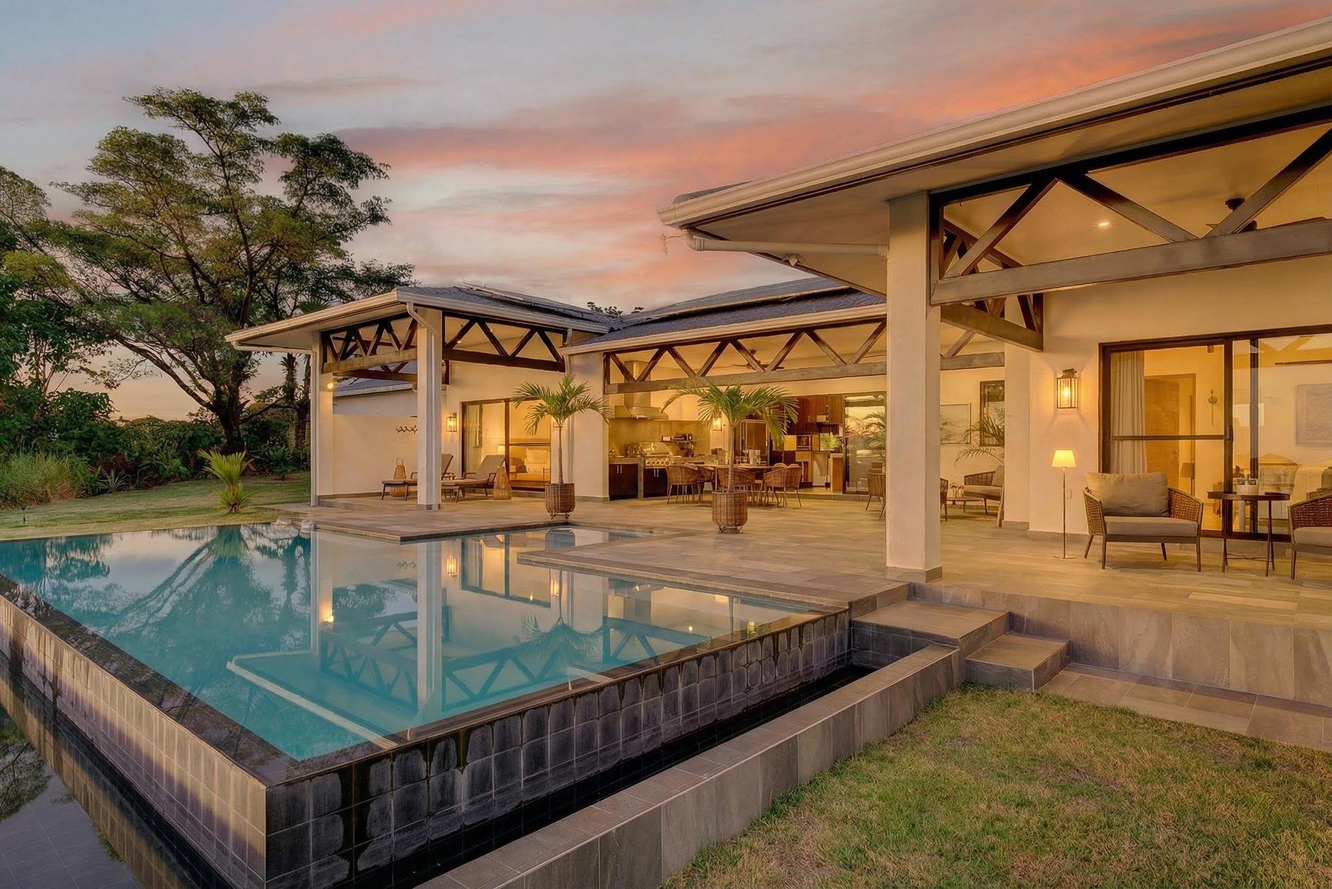 This oceanview residence is located in Morrillo, along the Azuero Peninsula’s west coast, and is positioned on an elevated lot that provides privacy while remaining only minutes from the beach. The setting allows the home to capture open views toward the Pacific and enjoy the region’s well-known sunset displays. The main living area of this 2-bedroom, 2.5-bathroom home follows an open-concept layout. Floor-to-ceiling windows frame the ocean views and allow natural light to enter throughout the day, creating a strong visual connection between the interior spaces and the surrounding landscape. Hardwood ceilings contrast with modern flooring, giving the residence a clean and contemporary feel. Both bedrooms are designed to take advantage of the ocean-facing orientation and include carefully selected finishes. The interior layout flows directly toward an outdoor deck, where an infinity pool overlooks the coastline and provides a comfortable space to enjoy the views and evening sunsets. The elevated position of the property enhances privacy while maintaining practical access to the beach via a short pathway. This is a titled property with water service and electricity available. Below the main living level, there are two independent studio apartments. Each studio includes a bathroom and a small kitchenette, offering flexible use for guests or additional living space. This thoughtful layout allows the property to function both as a private residence and as a multi-use coastal home.