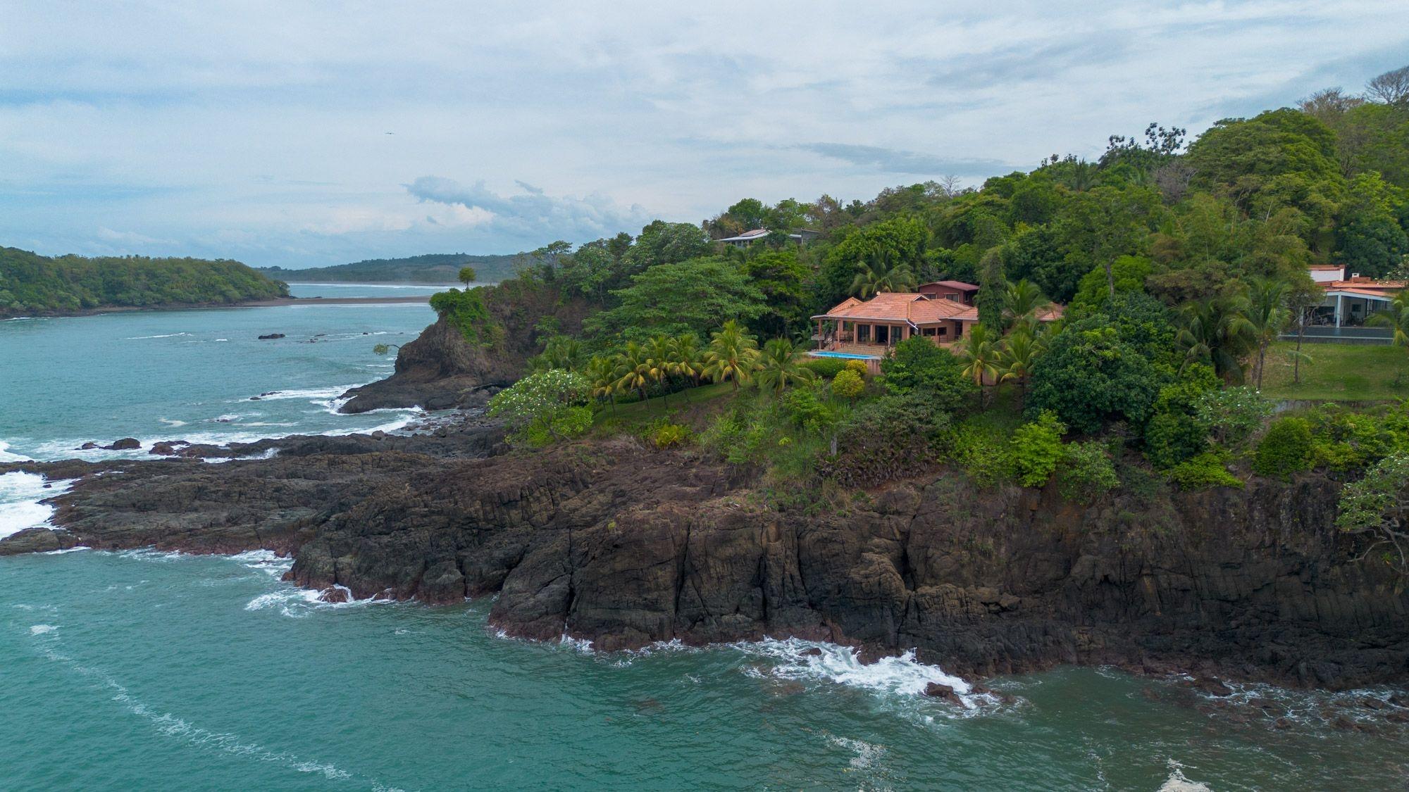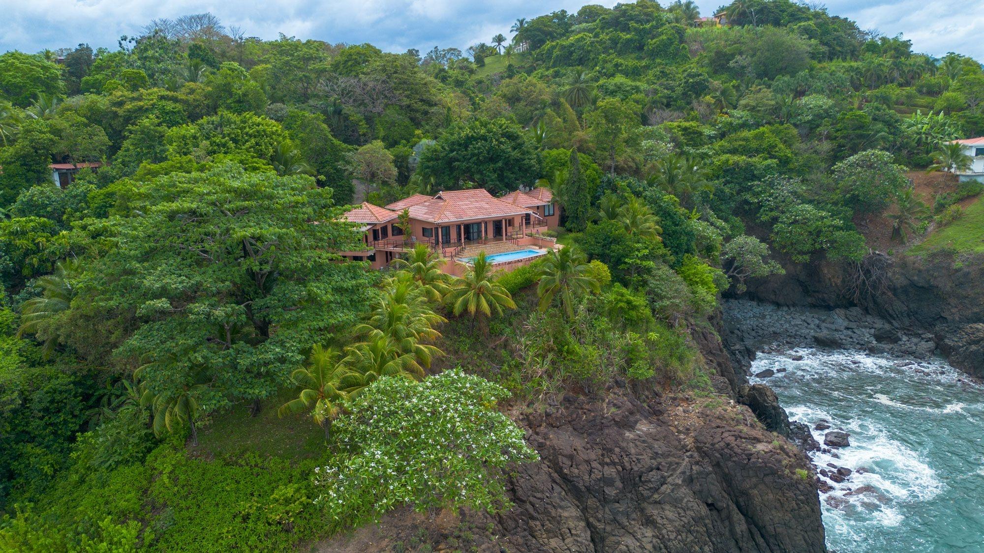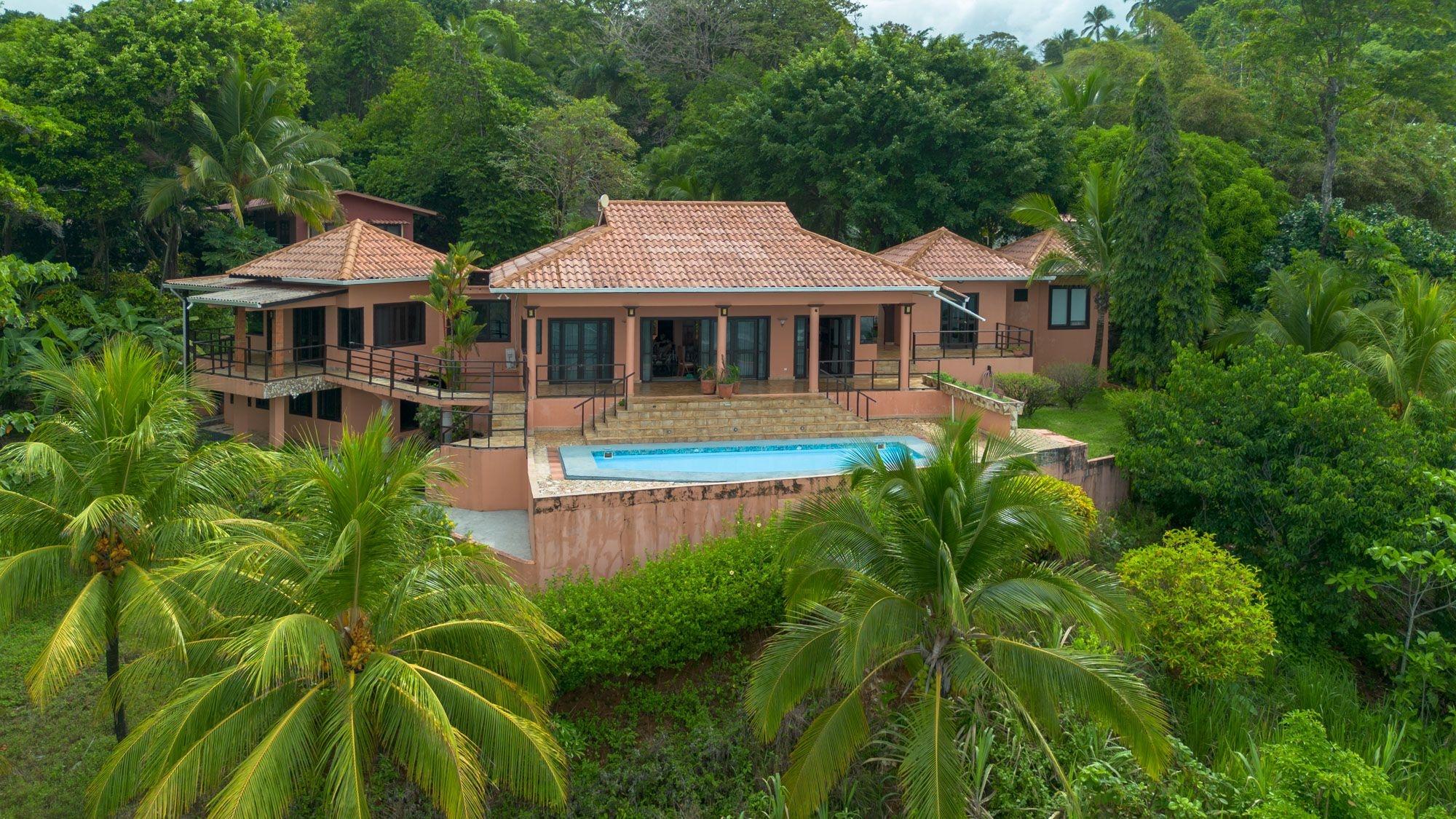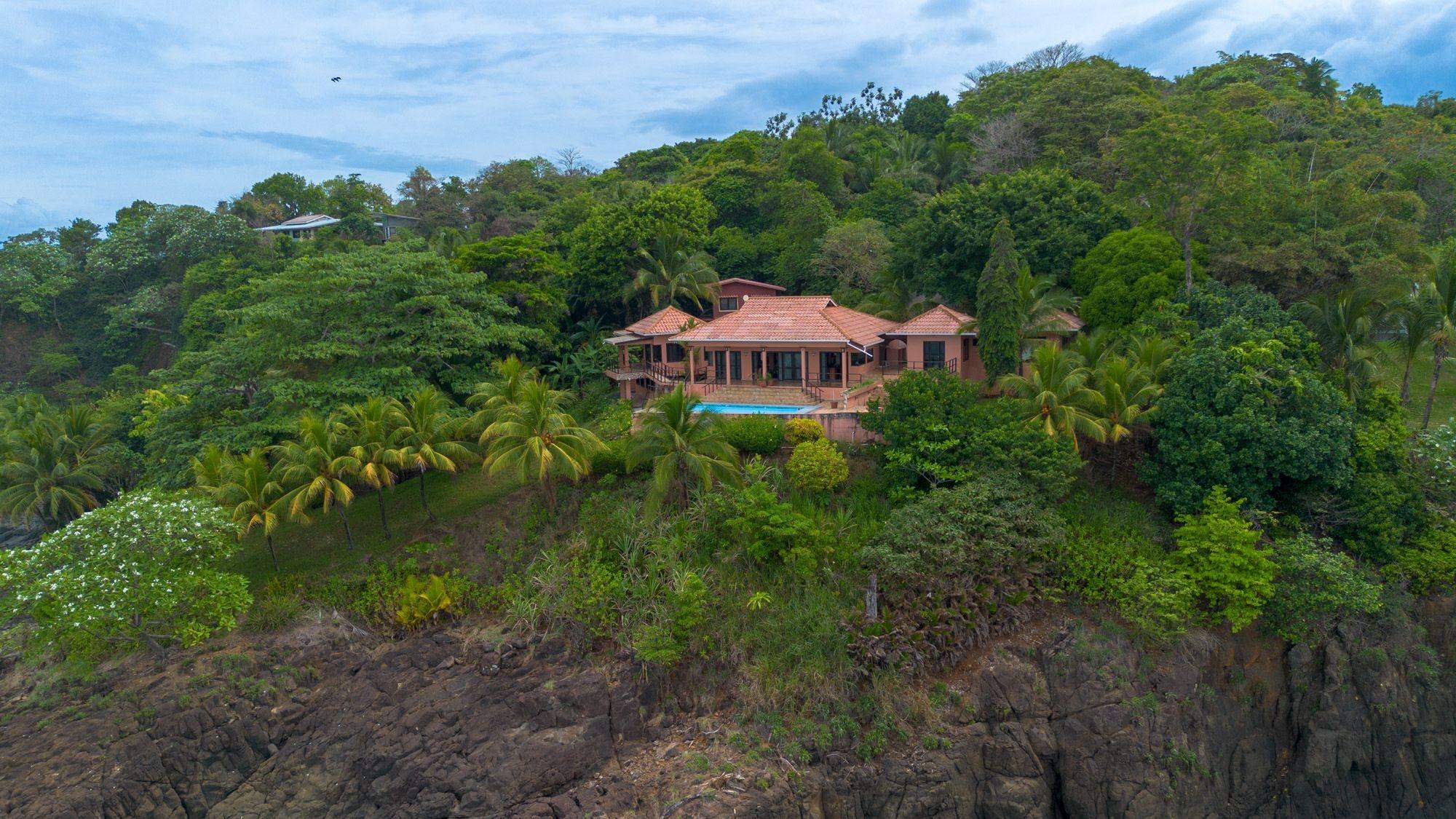 Set on a lush bluff above the Pacific, this oceanfront villa in Mata Oscura offers rare privacy, scenery, and immersion in nature. The main house features 3 bedrooms, 4 bathrooms, and a large flex room with private entrance – ideal for a guest suite or studio. A separate 2-bedroom casita sits above a 2-car garage. The titled 3,667 m² lot offers panoramic ocean views from nearly every room and outdoor space. The property combines tropical design with traditional materials, including a composite tile roof, vaulted wood-paneled ceilings, and wraparound terraces. Inside, an open layout connects the kitchen, dining, and living areas, all oriented toward the sea. Outside, the ocean-facing pool and sundeck are surrounded by mature fruit trees – banana, mango, papaya, avocado, sugar cane, and pineapple. Line and spear fishing are possible from the rocky shoreline below. Additional features include backup water storage, propane cooking, and parking for at least five vehicles. Water comes from a community well; power is supplied by Naturgy; internet is available. Three structures are joined by landscaped paths, offering flexibility for multi-generational living, rental income, or work-from-home life. A $50/month HOA fee supports roads, infrastructure, and shared landscaping. The gated community includes private access to nearby Morrillo Beach – known for surfing and swimming – and a rancho for personal or community use. House size is approximate.