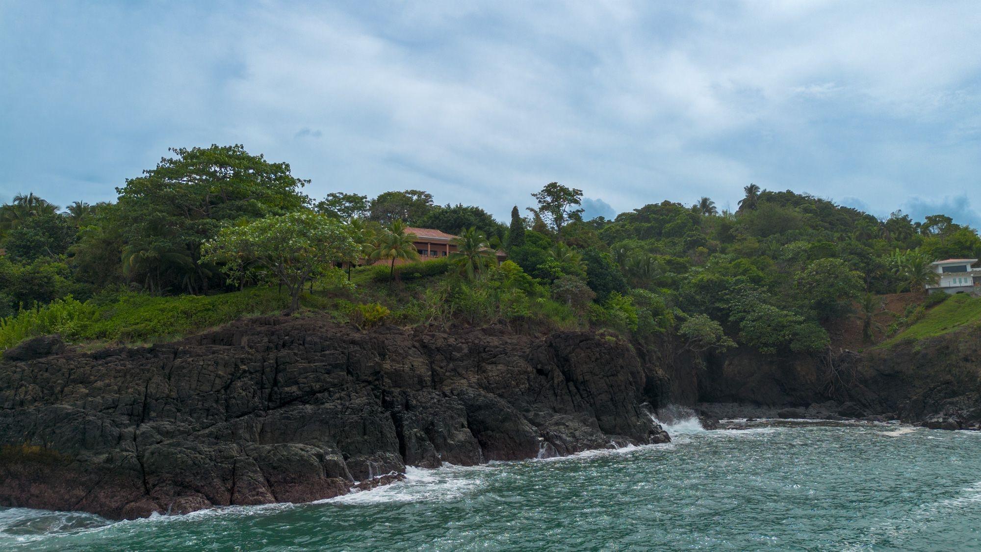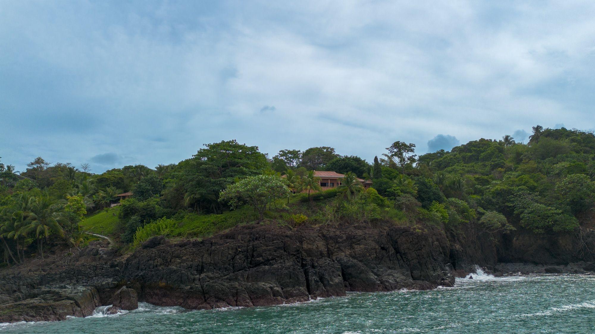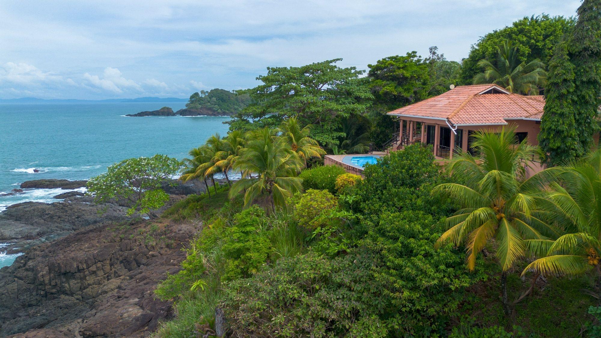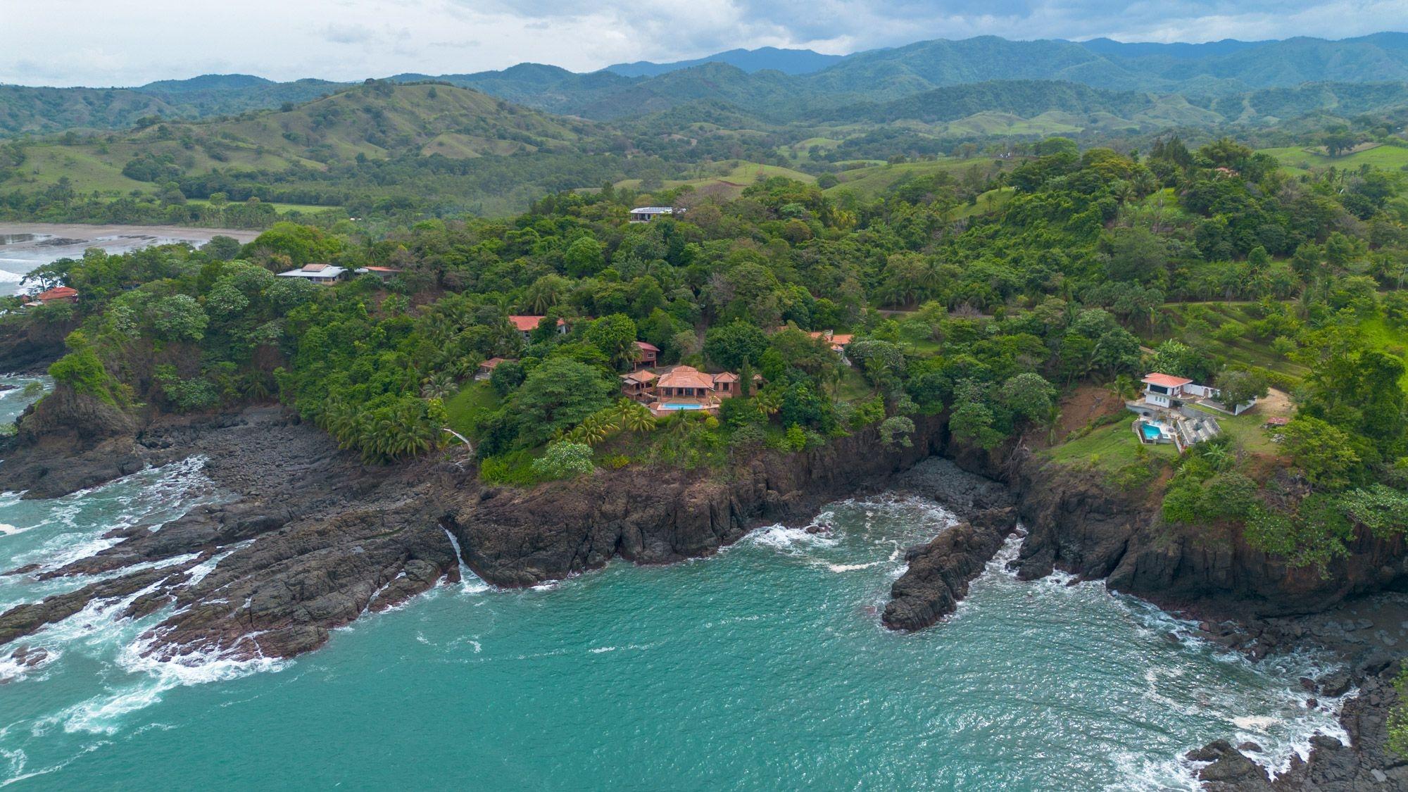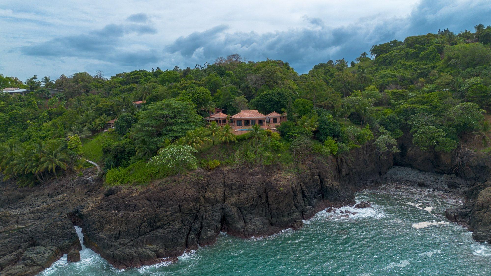 Set on a lush bluff above the Pacific, this oceanfront villa in Mata Oscura offers rare privacy, scenery, and immersion in nature. The main house features 3 bedrooms, 4 bathrooms, and a large flex room with private entrance – ideal for a guest suite or studio. A separate 2-bedroom casita sits above a 2-car garage. The titled 3,667 m² lot offers panoramic ocean views from nearly every room and outdoor space. The property combines tropical design with traditional materials, including a composite tile roof, vaulted wood-paneled ceilings, and wraparound terraces. Inside, an open layout connects the kitchen, dining, and living areas, all oriented toward the sea. Outside, the ocean-facing pool and sundeck are surrounded by mature fruit trees – banana, mango, papaya, avocado, sugar cane, and pineapple. Line and spear fishing are possible from the rocky shoreline below. Additional features include backup water storage, propane cooking, and parking for at least five vehicles. Water comes from a community well; power is supplied by Naturgy; internet is available. Three structures are joined by landscaped paths, offering flexibility for multi-generational living, rental income, or work-from-home life. A $50/month HOA fee supports roads, infrastructure, and shared landscaping. The gated community includes private access to nearby Morrillo Beach – known for surfing and swimming – and a rancho for personal or community use. House size is approximate.