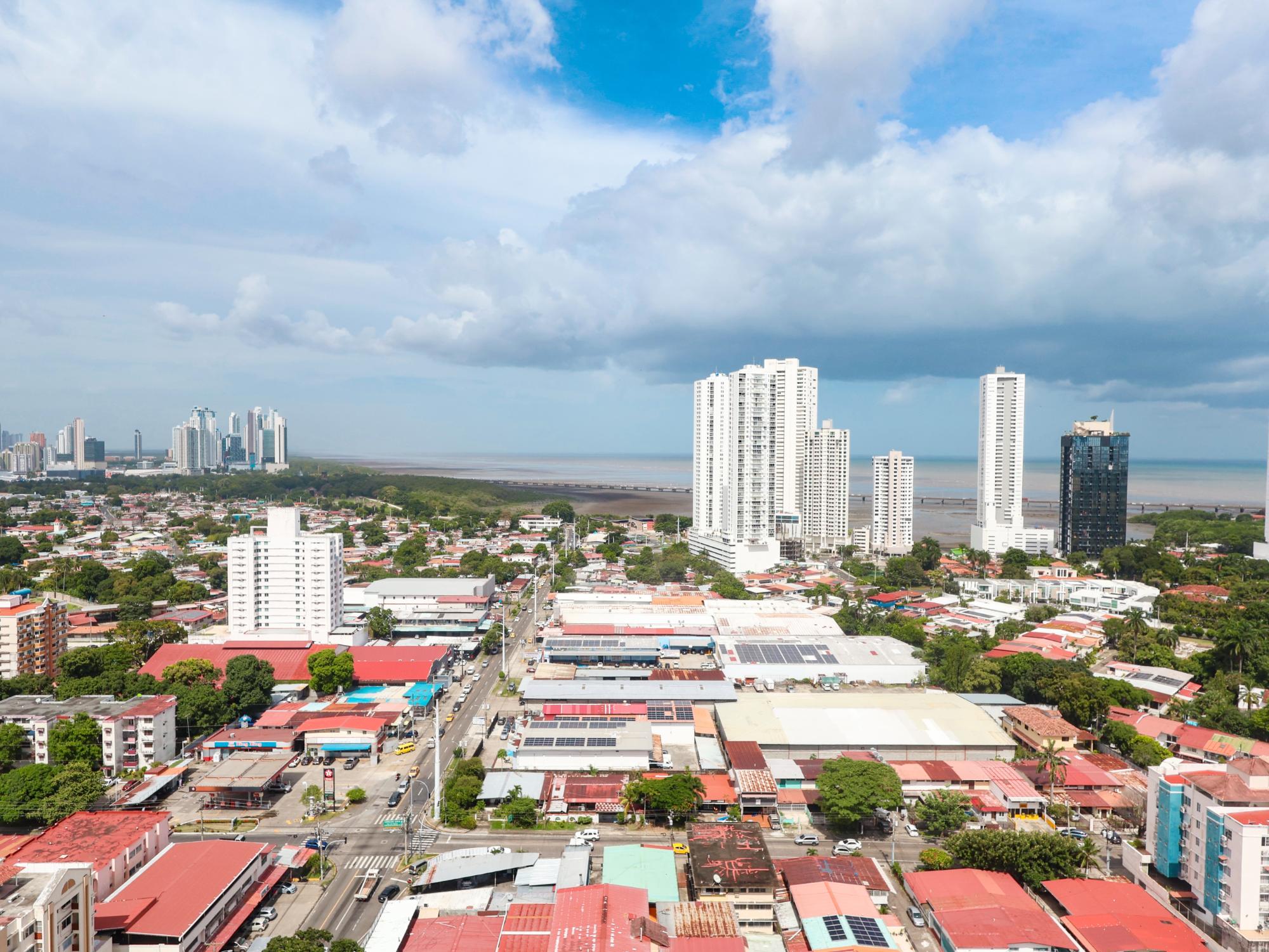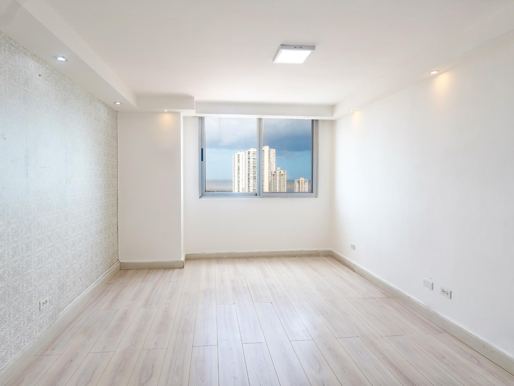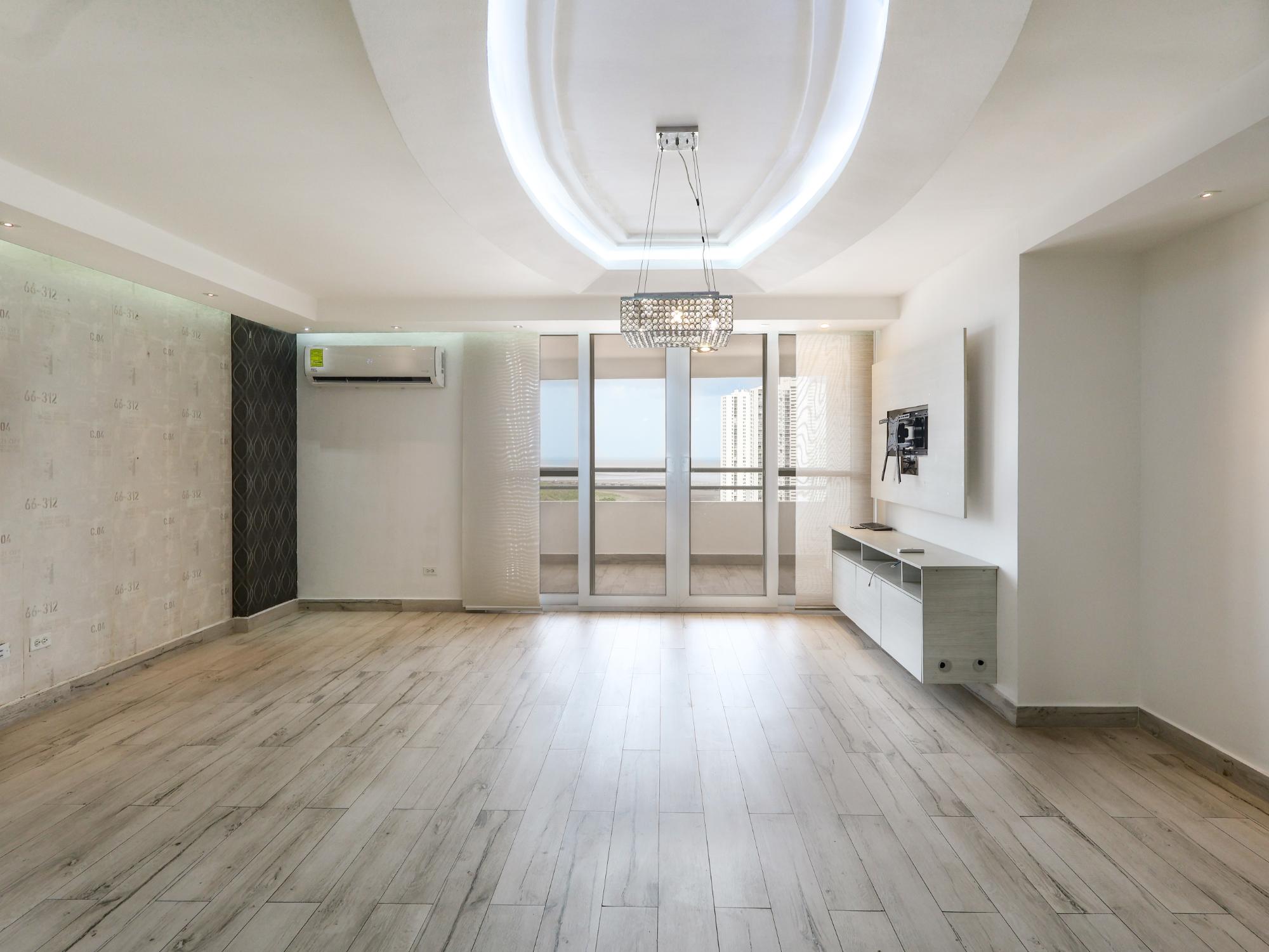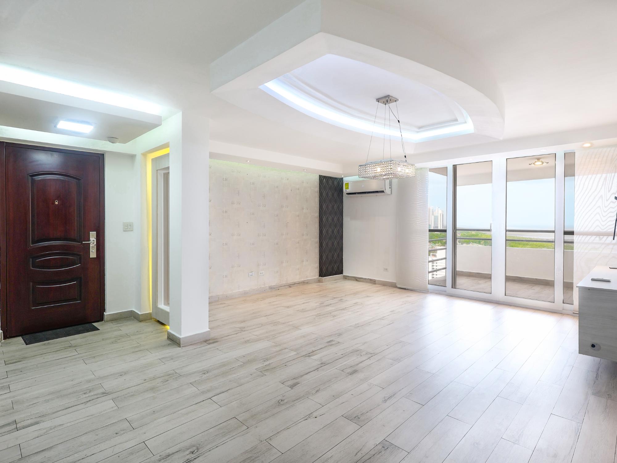 The Penthouse with ocean and city views located on Ernesto T Lefevre has 3 bedrooms, 2 and a half bathrooms, and 2 parking spaces. It has a common area with a pool, party room, and a gym. With finishes such as a false ceiling with lights, a security door, thermoacoustic windows, a hydromassage shower, and a tempered glass door. Sold with lamps and air conditioners. Close to Omar Park, supermarkets, banks, schools, restaurants, and access to Via España, Coco del Mar, and Costa del Este.