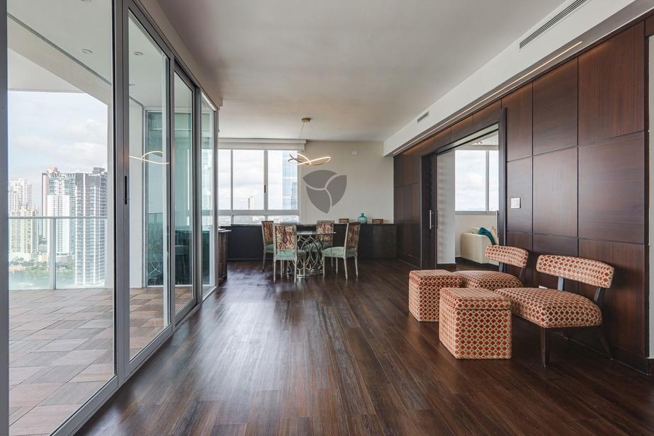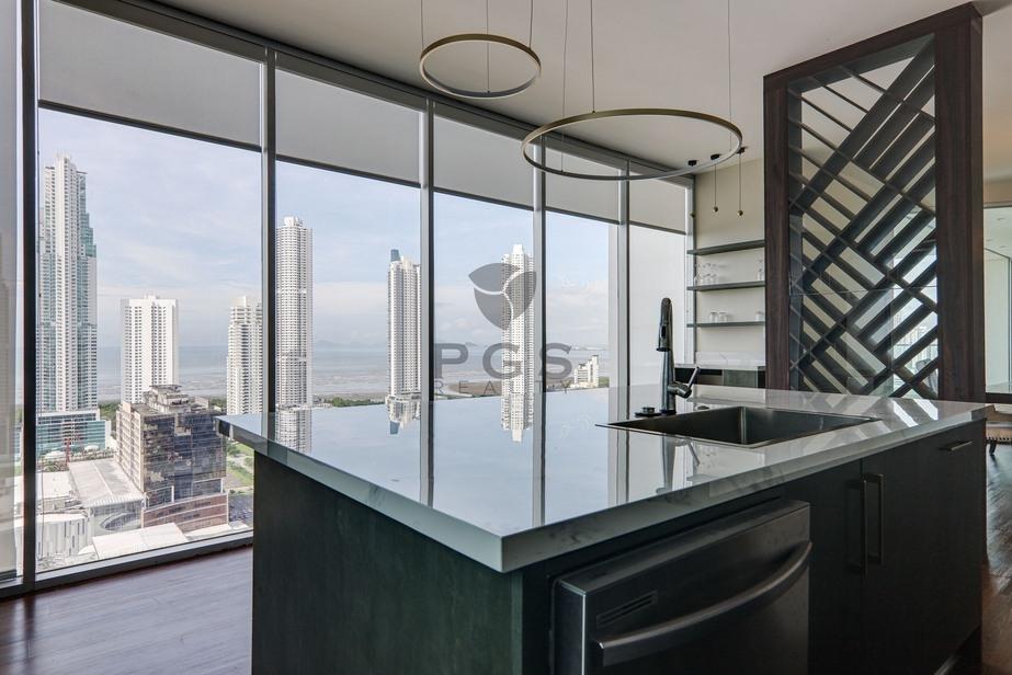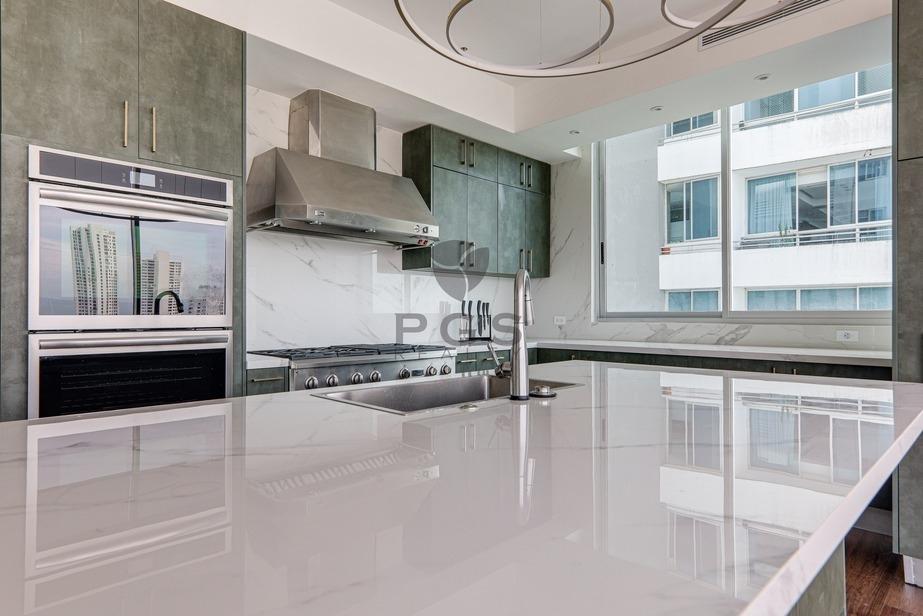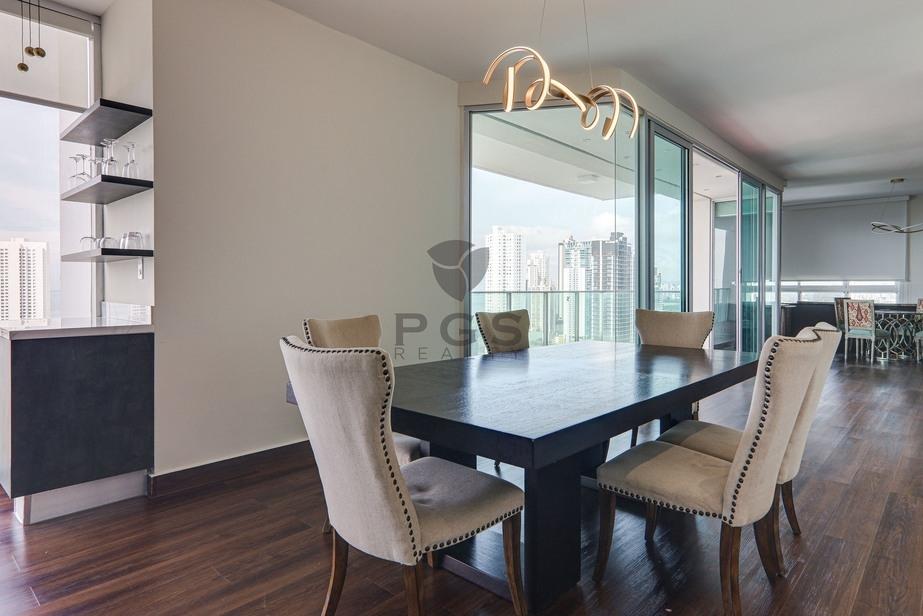 Features of this stunning property include: Large balcony and floor-to-ceiling windows with panoramic views of the Costa del Este skyline and the Pacific Ocean beyond Open-concept living-dining-kitchen area with energy-efficient central A/C system Family room/den that can be enclosed with sliding doors Gourmet kitchen with top-quality stainless steel appliances and quartz stone countertop Separate bar area with wine fridge and custom wine display rack Master suite with luxurious walk-in closet, additional closet and remodeled in-suite bathroom Two additional bedrooms with walk-in closets and private bathrooms Maid’s quarters equipped with A/C Large laundry room with natural ventilation Three assigned parking spots on a low floor Large storage unit